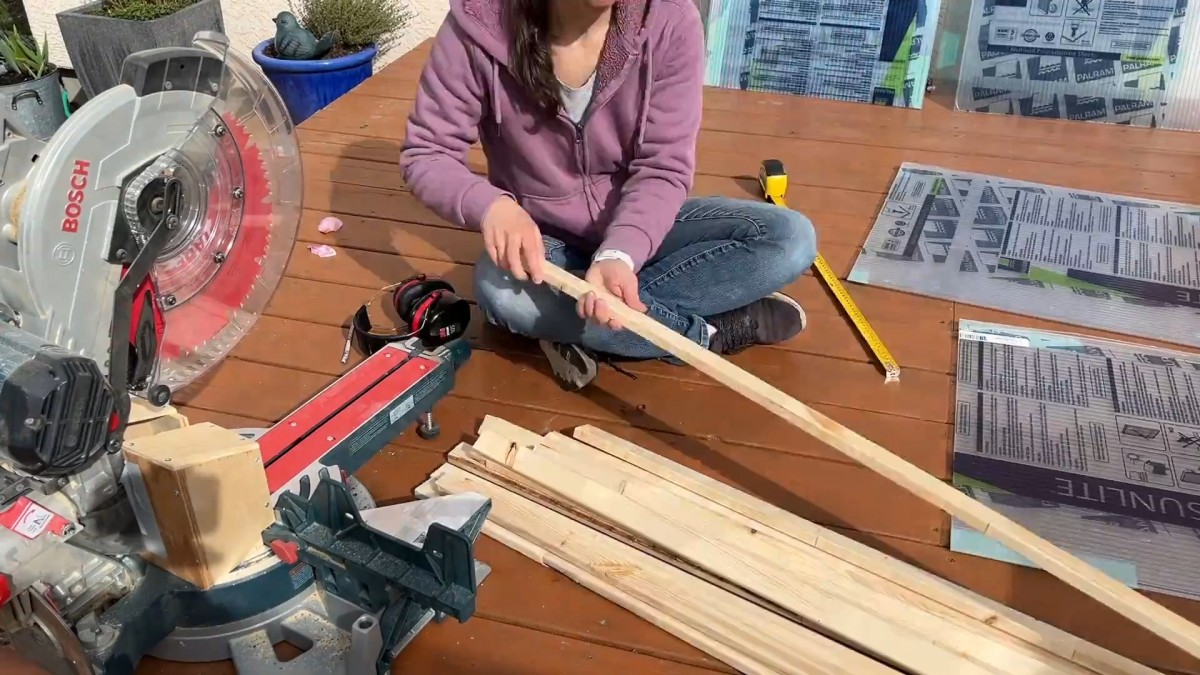 Postupně řežeme jednotlivé díly rámu na pokosové pile podle rozměrů vycházejících z připravených plastových panelů.