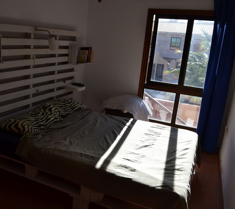 Ložnice je skromná a postel zůstala původní sestavená z palet. Zvykli si na ní a neměnili by