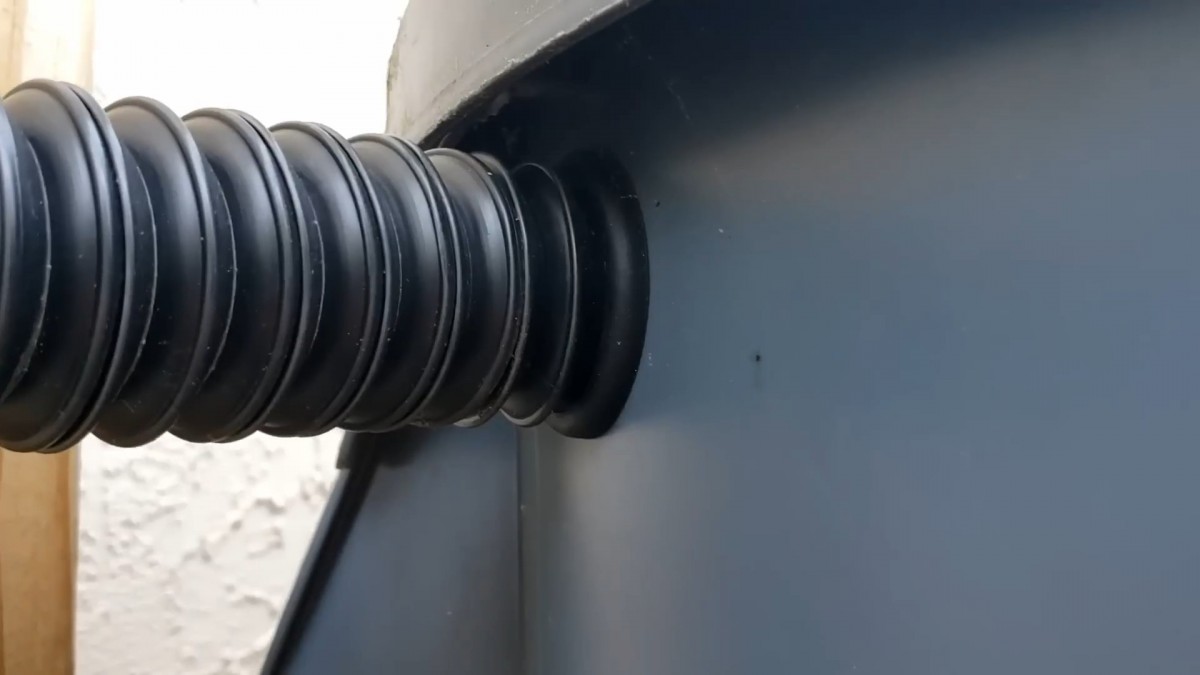 Vlnitá hadice je napojená do stěny sudu přes průchodku. Právě tudy přitéká voda ze svodu přímo do nádoby