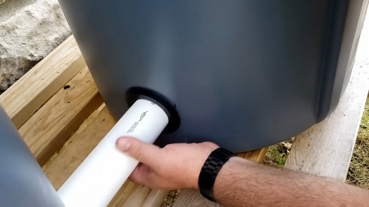 Trubka se zasouvá i do druhého sudu, aby došlo k propojení. Teď přichází důležitý krok, spoj musí být rovný a bez pnutí