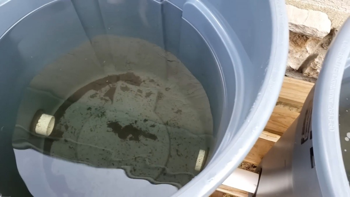 V sudu je vidět nashromážděná dešťová voda s drobnými nečistotami na dně. To je běžné, proto se voda hodí hlavně na zálivku