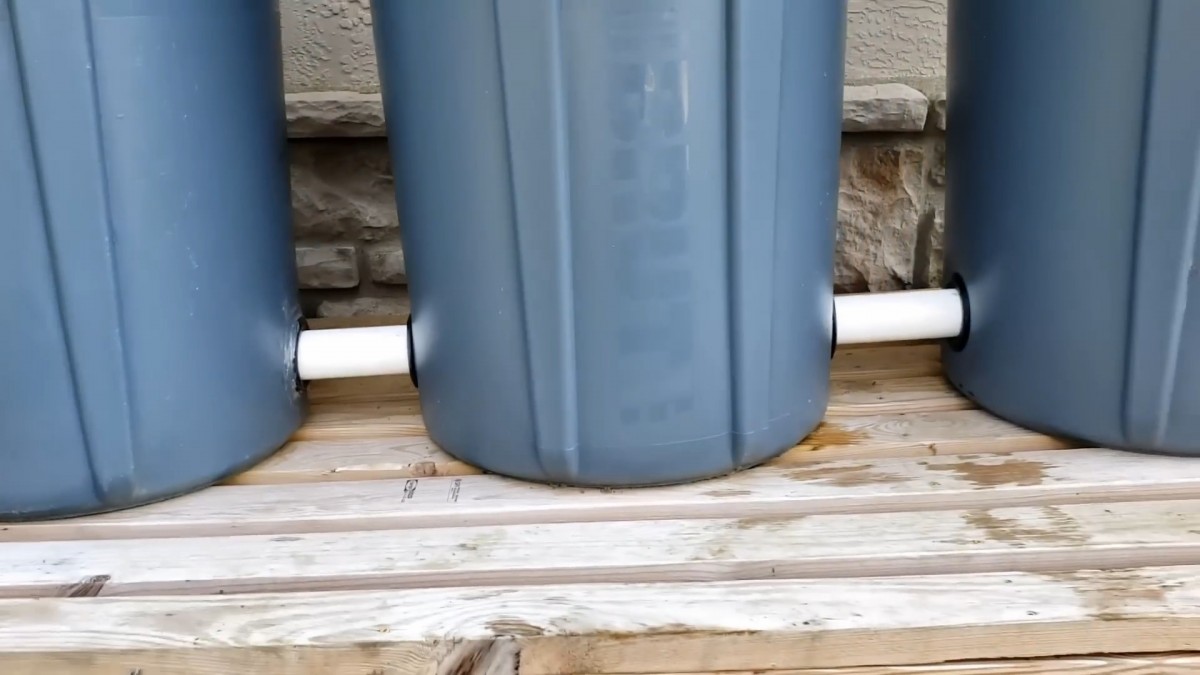 Spodní část sudů ukazuje jejich vzájemné propojení pomocí trubek. Díky tomu se voda rozlévá rovnoměrně mezi všechny nádoby