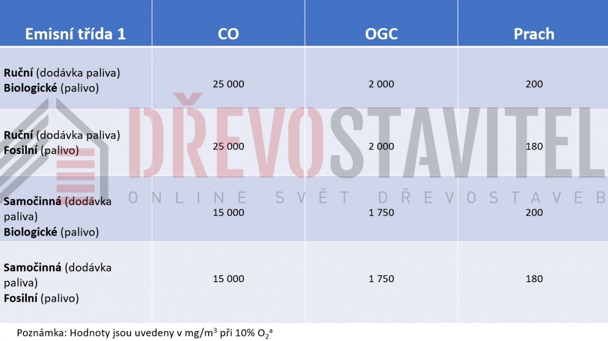 Kotle 1. emisní třídy – Mezní hodnoty oxidu uhelnatého (CO), organických uhlovodíků (OGC) a prachu