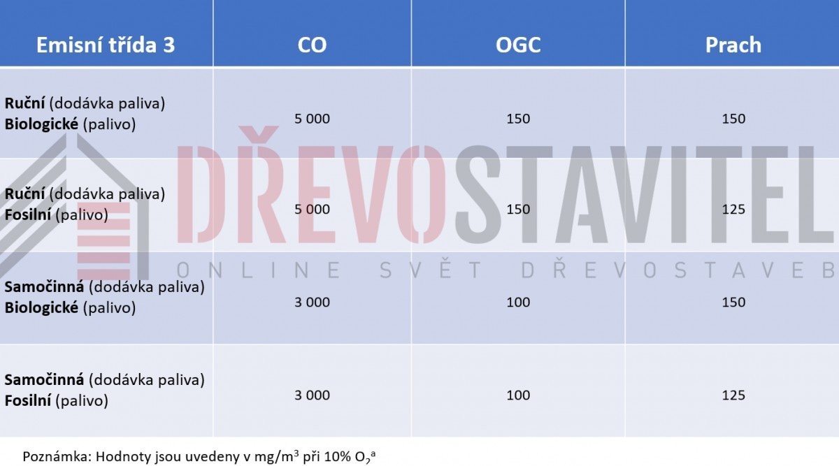 Kotle 3. emisní třídy – Mezní hodnoty oxidu uhelnatého (CO), organických uhlovodíků (OGC) a prachu