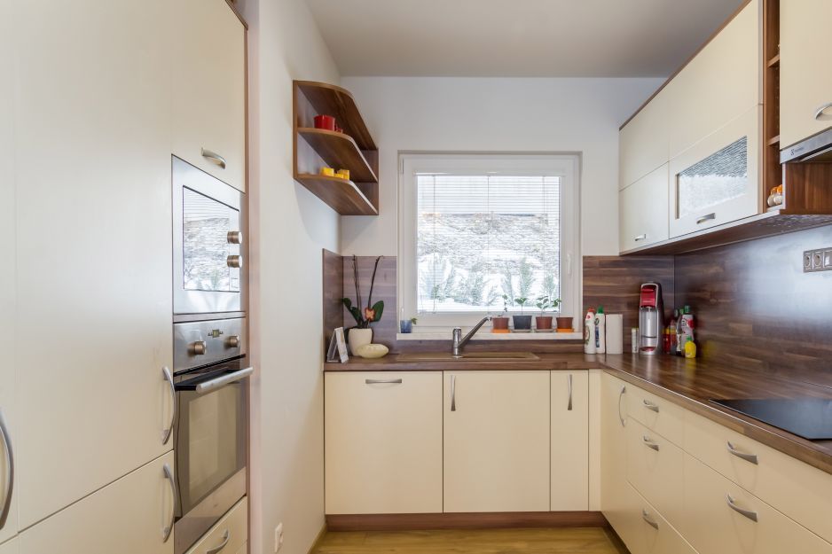 Do moderního bungalovu zvolili bílou kuchyni v kombinaci se dřevem