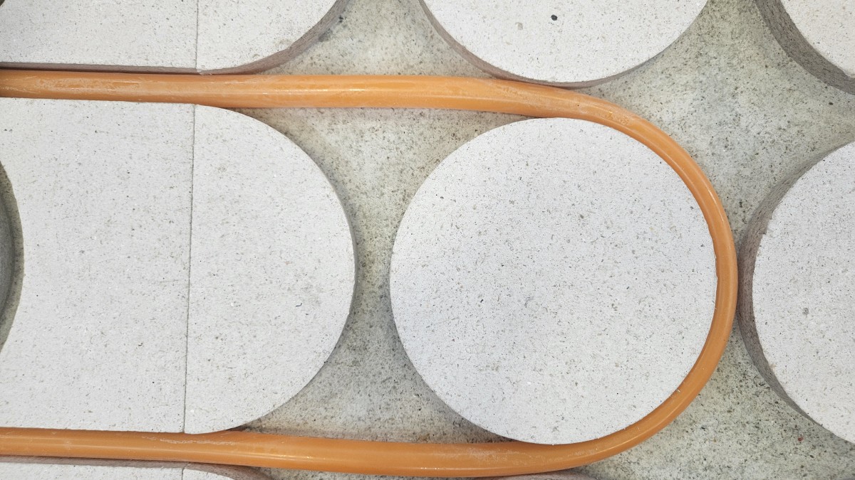 Detail oranžové topné trubky obtočené kolem kruhového podlahového prvku (puku), který umožňuje plynulý ohyb bez lámání.