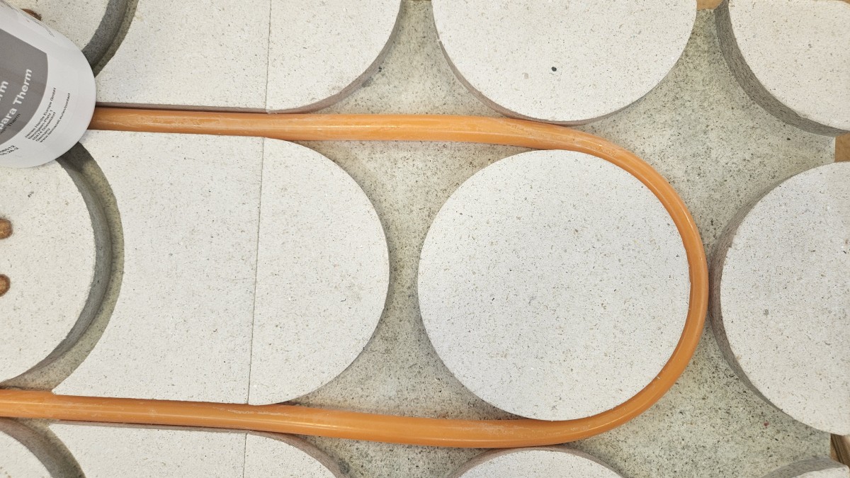 Pohled shora na vedení topné hadice. Ukazuje přesný ohyb kolem kruhového dílce a přechod do rovného vedení v drážkách.