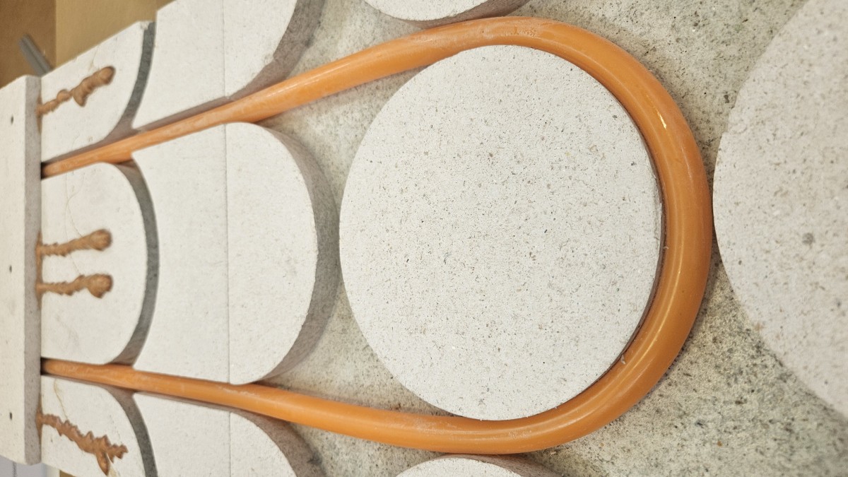 Širší záběr na položené trubky tvořící smyčku kolem puků. Na sousední desce je již naneseno lepidlo pro další vrstvu.