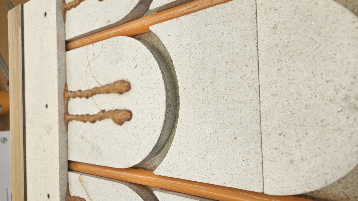 Celkový pohled na rovnoběžné vedení trubek a ohyby. Horní deska s naneseným lepidlem je připravena k instalaci krycí vrstvy.