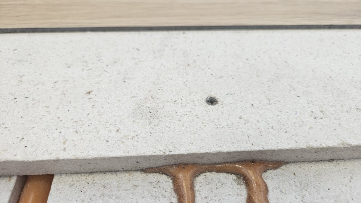 Zaklápění systému vrchní deskou. Je vidět, jak se nanesené lepidlo mírně vytlačuje ve spáře nad uloženou topnou trubkou.