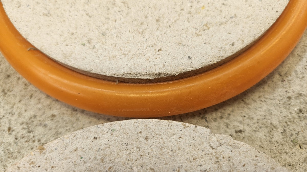 Detailní záběr na ohyb oranžové topné trubky kolem hrany kruhového prvku, ukazující čistotu provedení podlahového systému.