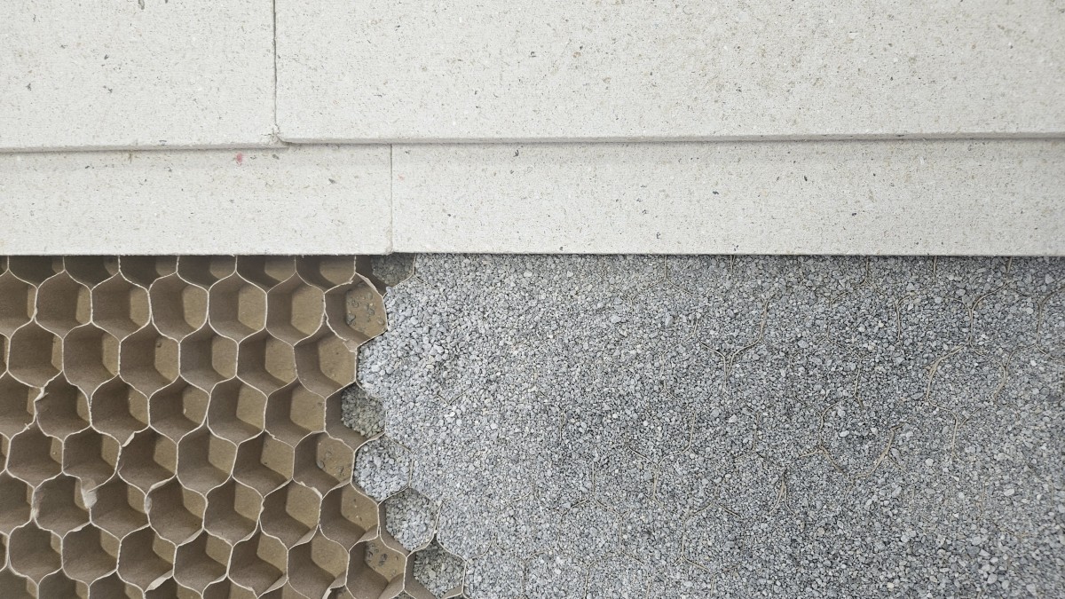 Ukázka přípravy podkladu. Kartonová voština částečně vyplněná šedým vyrovnávacím podsypem, těsně přiléhající k plné desce.
