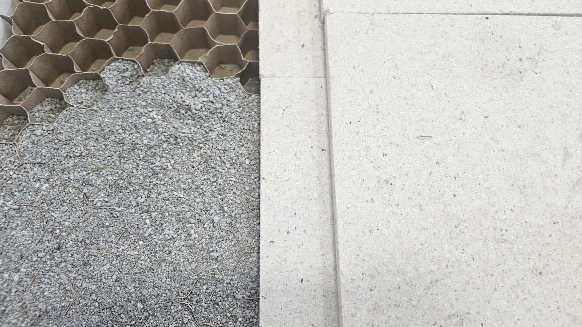 Pohled na papírovou voštinovou strukturu, do které se sype šedý vyrovnávací granulát pro zajištění stability a akustiky.
