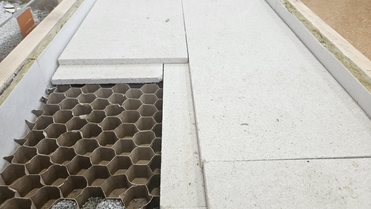Celková skladba podlahového systému_ od prázdné voštiny, přes vyplněnou část podsypem až po finálně položené pevné desky.