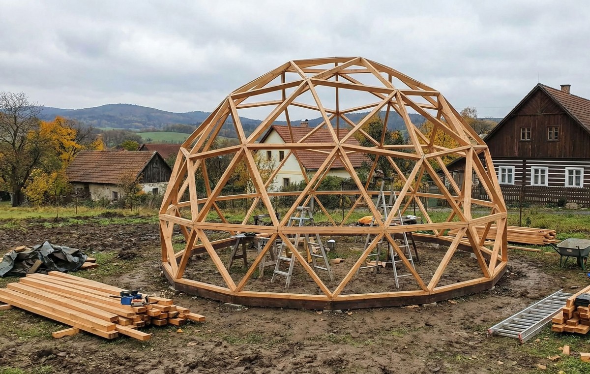 Latě smontujeme do tvaru kupole, tedy tzv. geodome již na místě, kde chceme skleník umístit