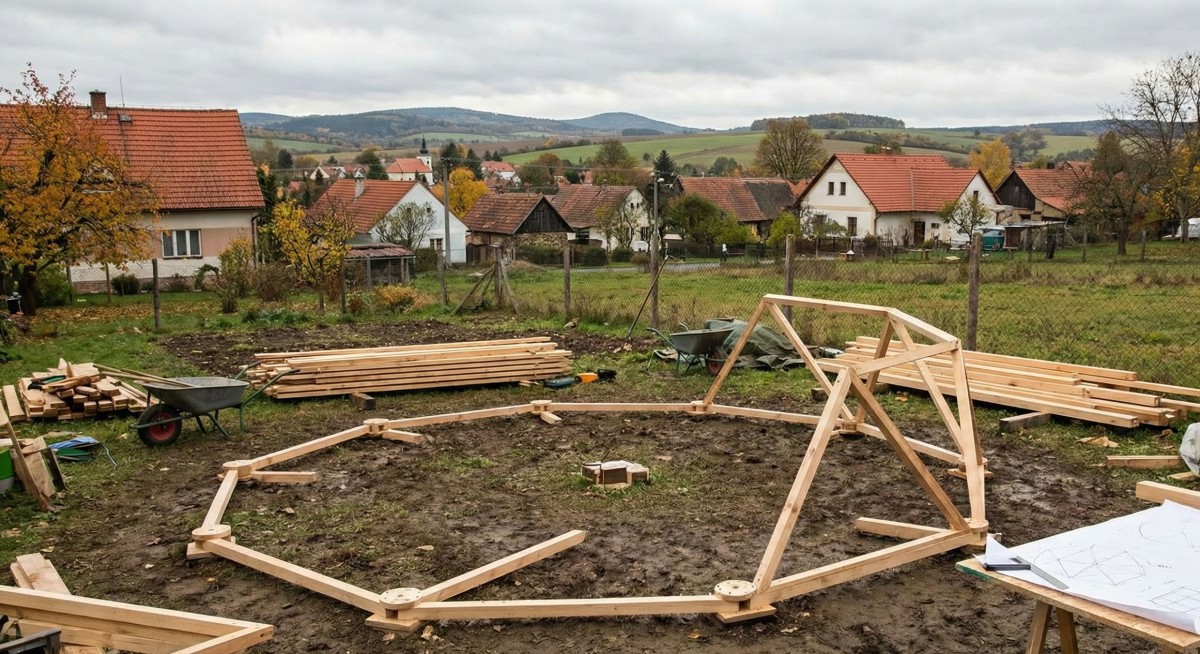 Stavba geodome skleníku svépomocí začíná tak, že si připravíme a nařežeme jednotlivé latě
