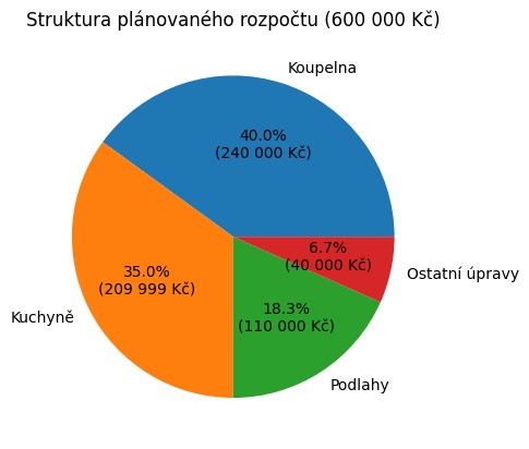 Graf jasně ukazuje, že největší část rozpočtu tvořila koupelna (40 %) a kuchyně (35 %), takže prostor pro nečekané výdaje byl minimální