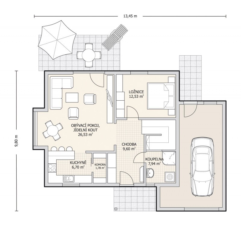V přízemí se nachází hlavní obytný prostor propojující kuchyň, jídelnu a obývací část. Nechybí ani technické zázemí a samostatný pokoj