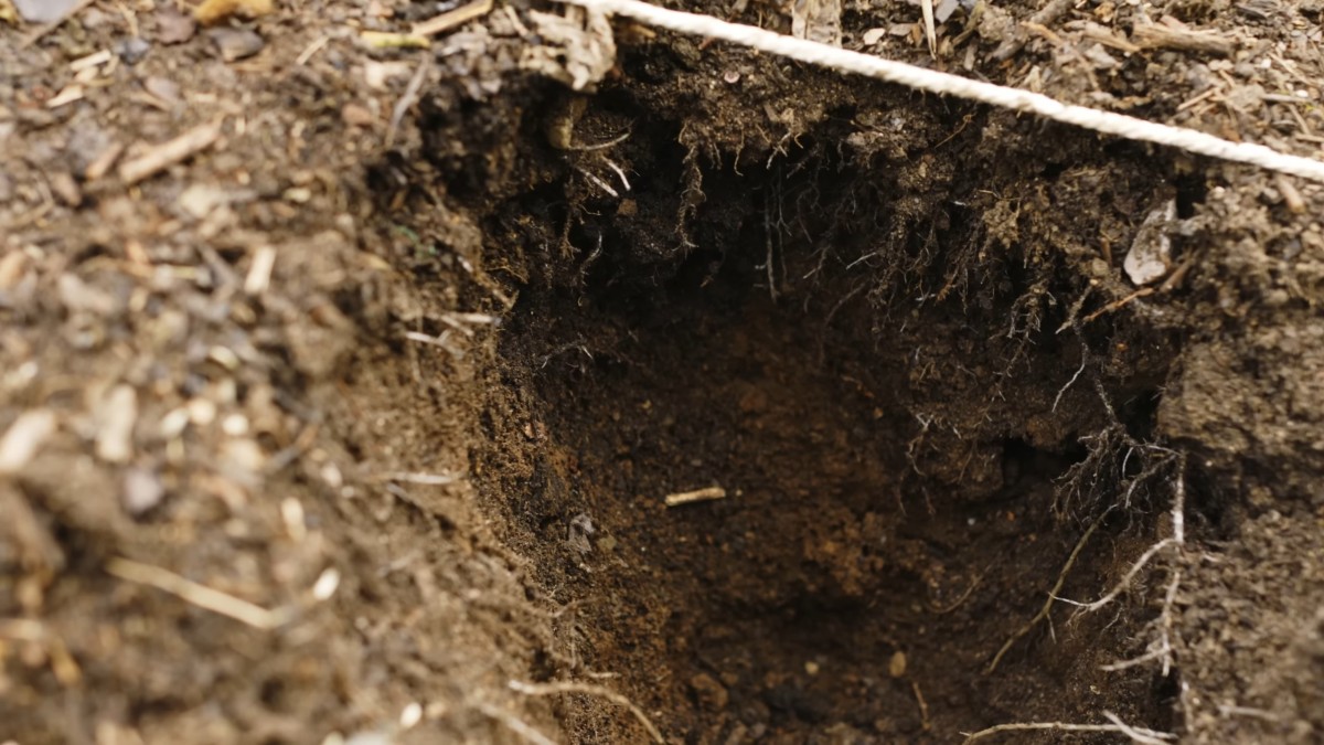Profil půdy ukazuje vrstvy a neporušenou strukturu bez rytí. Kořeny a organismy vytvářejí přirozené kanály pro vodu a vzduch
