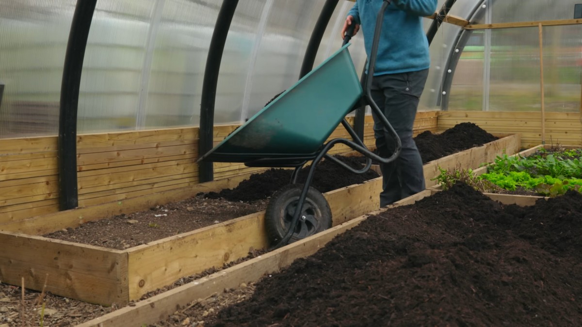 Kompost se naváží na záhony i ve skleníku bez rytí půdy. Pravidelná vrstva udržuje úrodnost a zlepšuje strukturu půdy