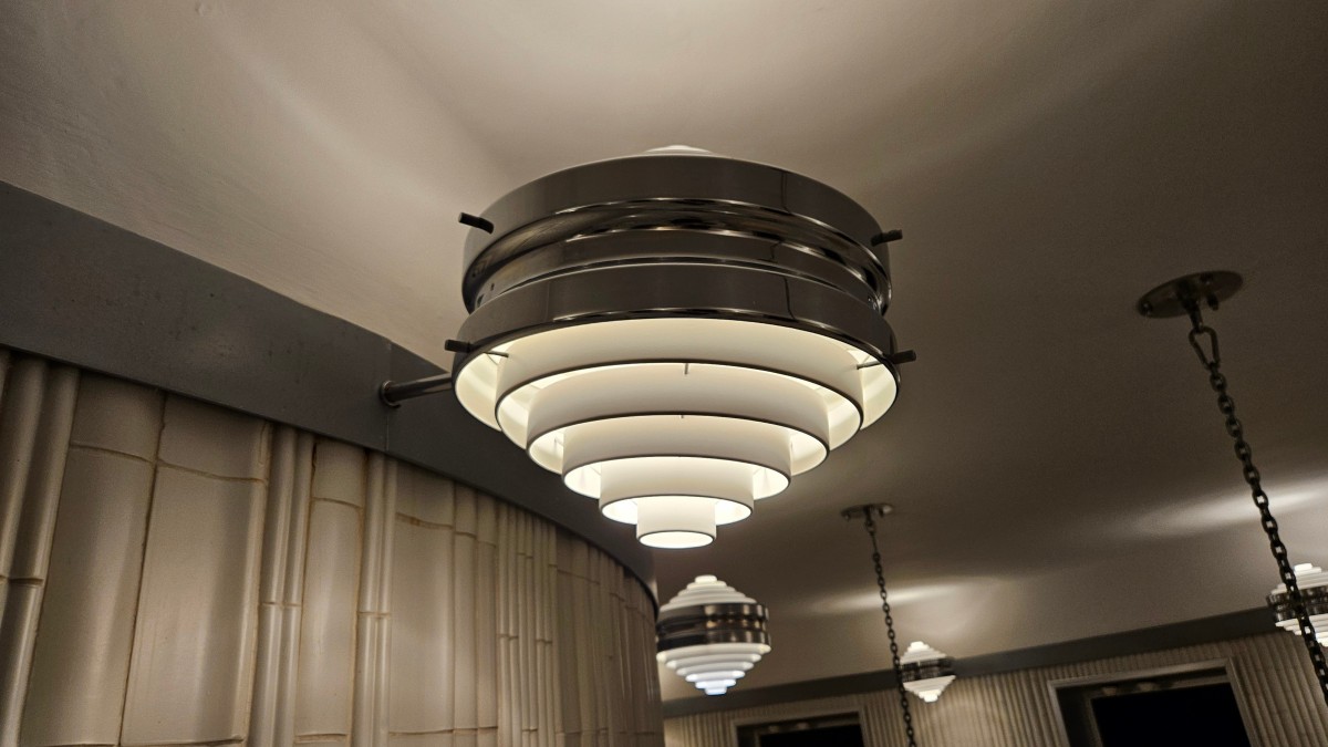 Pohled na strop a stylové dobové osvětlení ve společných chodbách budovy, které dokresluje unikátní atmosféru