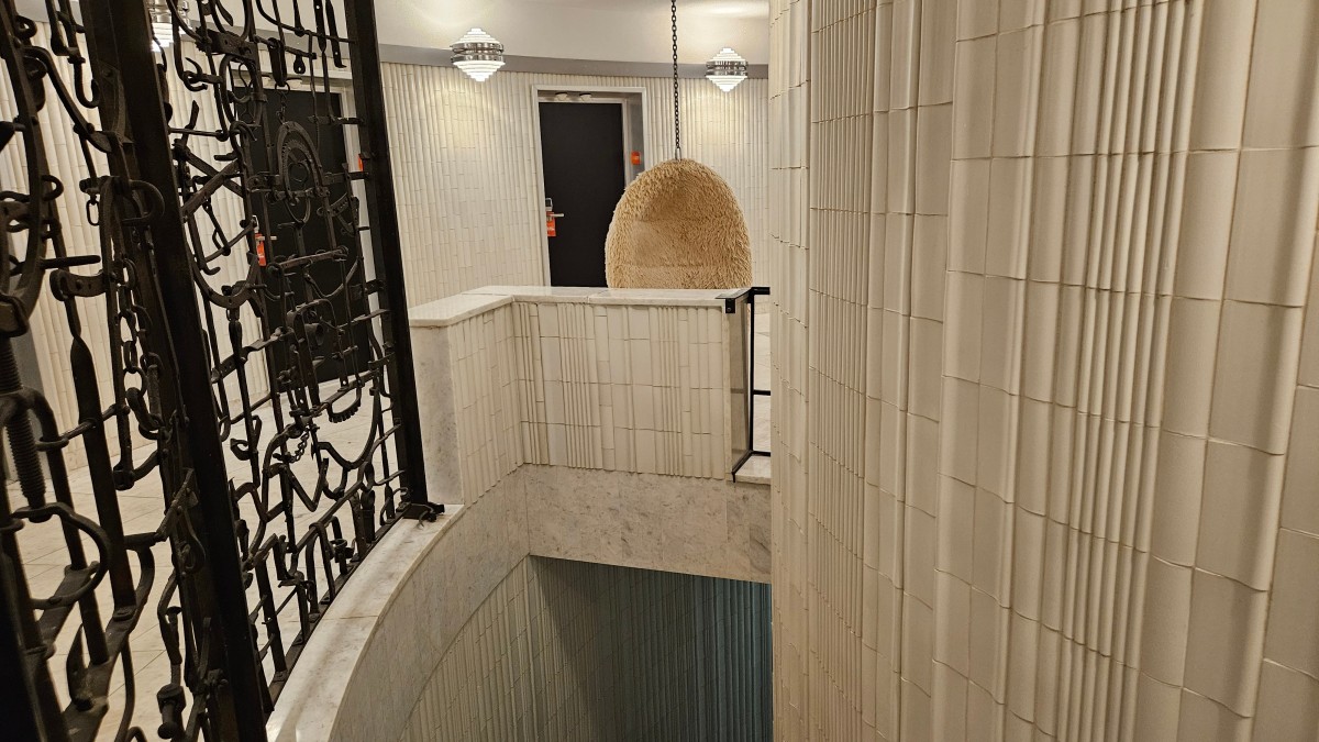 Stěna se specifickým obložením geometrických tvarů a výrazným betonovým prvkem ve tvaru obráceného jehlanu.