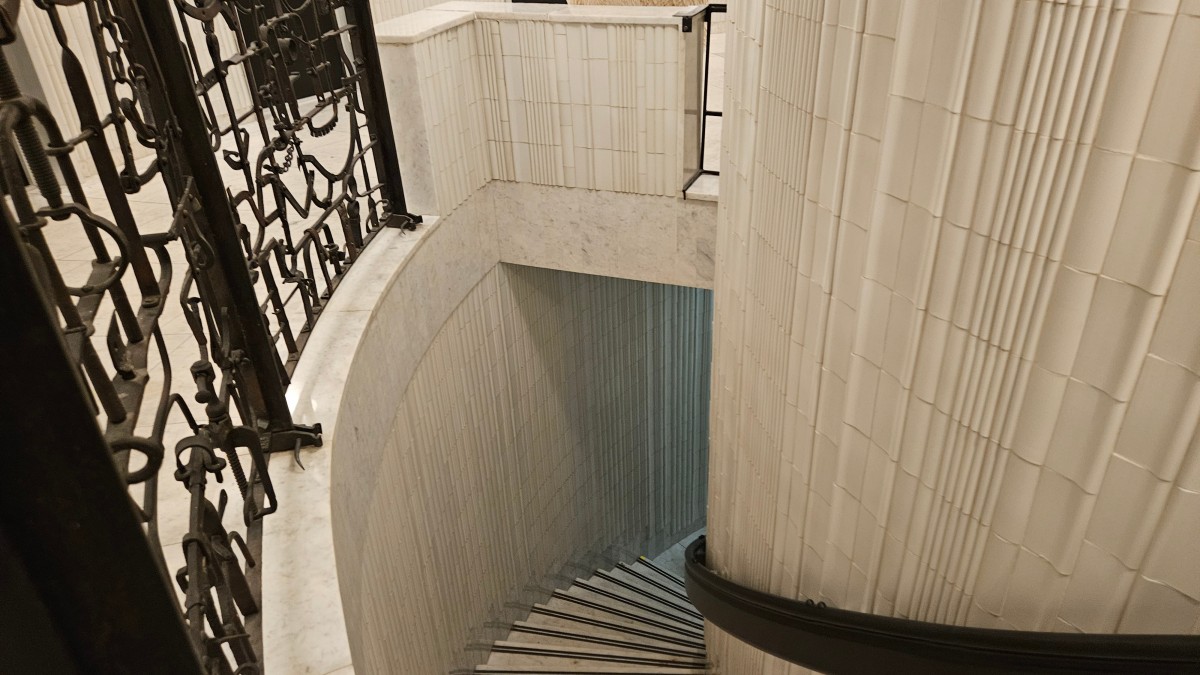 Detail části schodiště doplněný ozdobnými mřížemi a zajímavě texturovaným obkladem zdi, pravděpodobně keramickým.