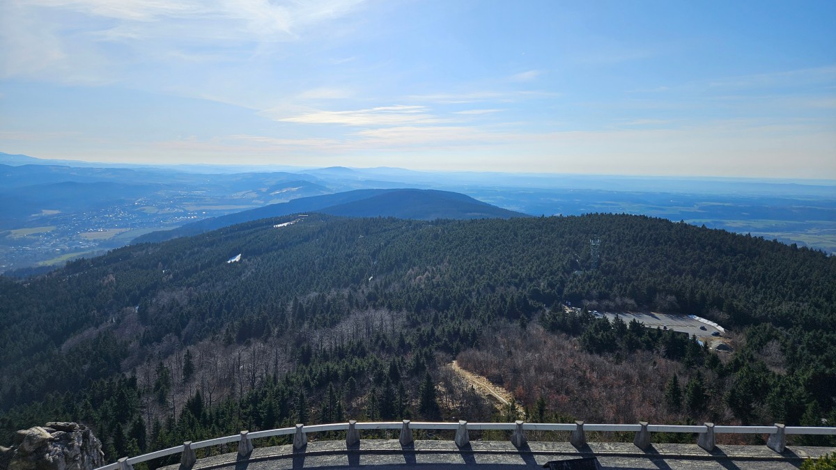 Panoramatický pohled do sluncem zalité krajiny, ukazující vrstvy lesů a nekonečných kopců táhnoucích se do dálky