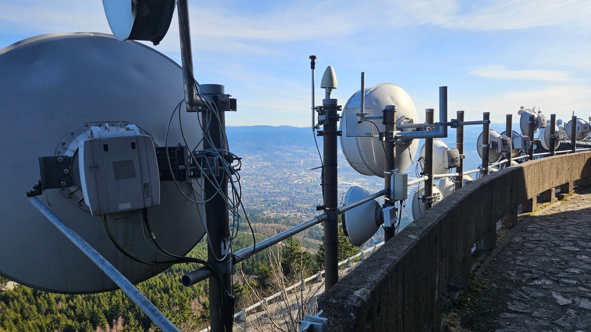 Pohled z vnější kovové vyhlídky skrz vysílače dolů na zalesněné hřebeny zalité ranním sluncem.