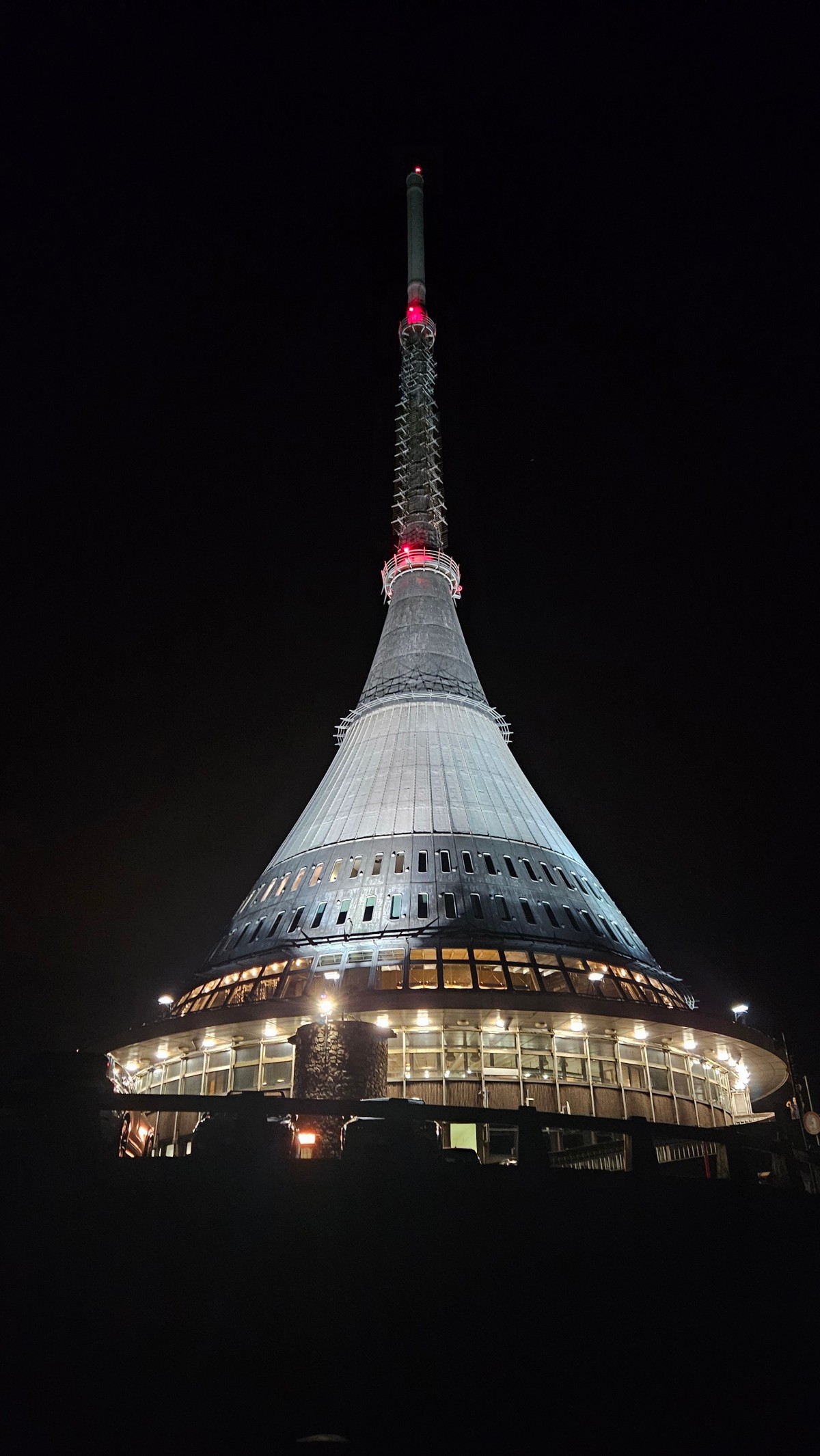 Působivý noční snímek nasvíceného televizního vysílače Ještěd, který jasně a magicky září do temné noční oblohy.
