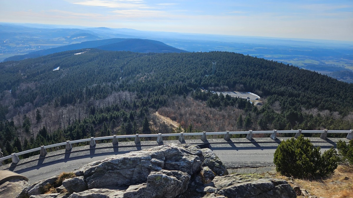 Úchvatný ranní výhled z Ještědu na rozlehlou zalesněnou krajinu a část města Liberec rozprostírajícího se v údolí.
