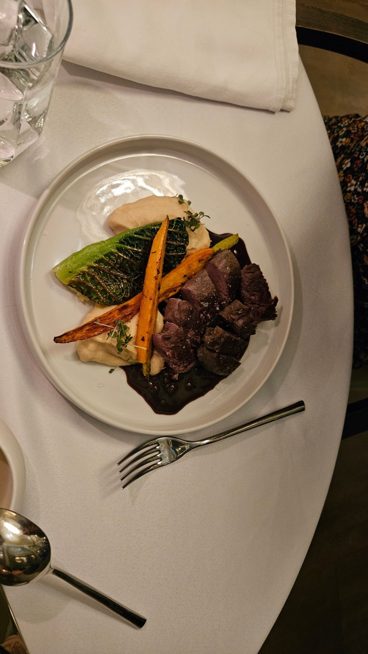 Další chod večeře sestávající z elegantně naservírovaného pokrmu s omáčkou a bylinkami v bílém talíři.
