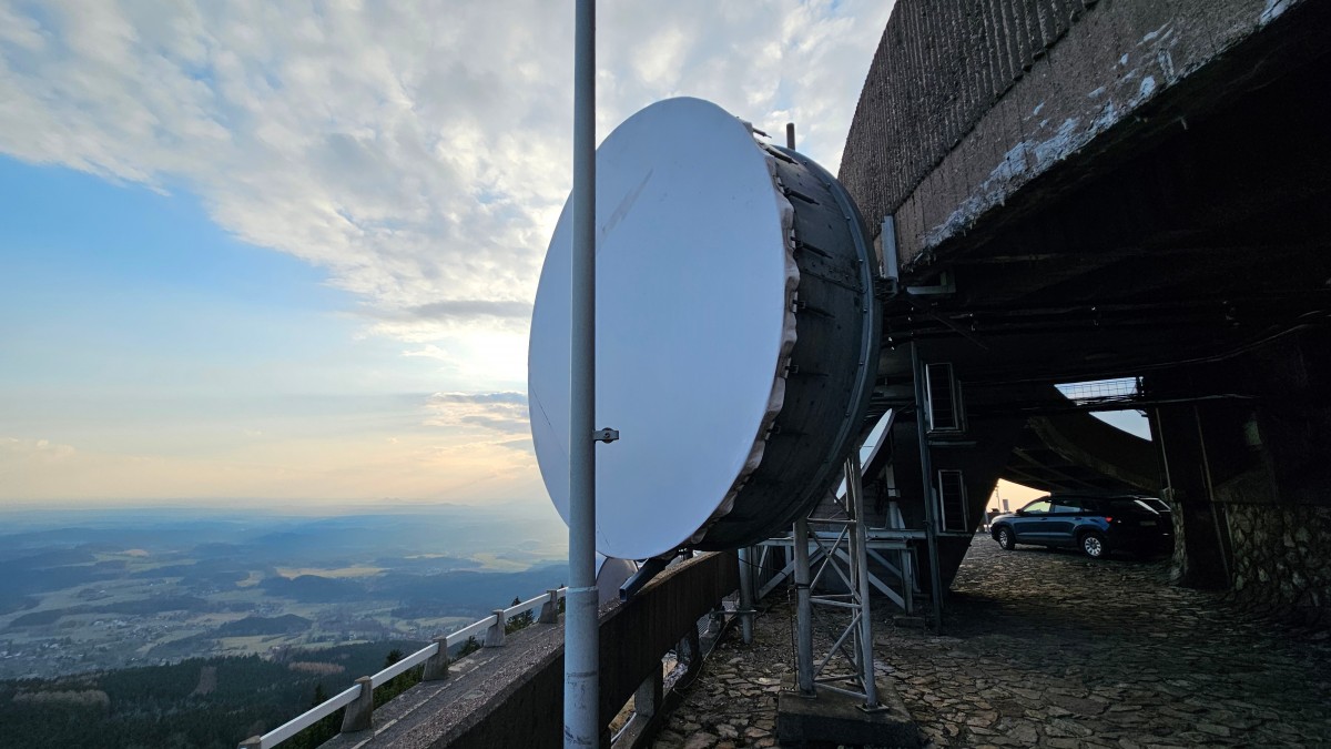 Detailní pohled na obří parabolickou anténu umístěnou na venkovním ochozu telekomunikačního vysílače.