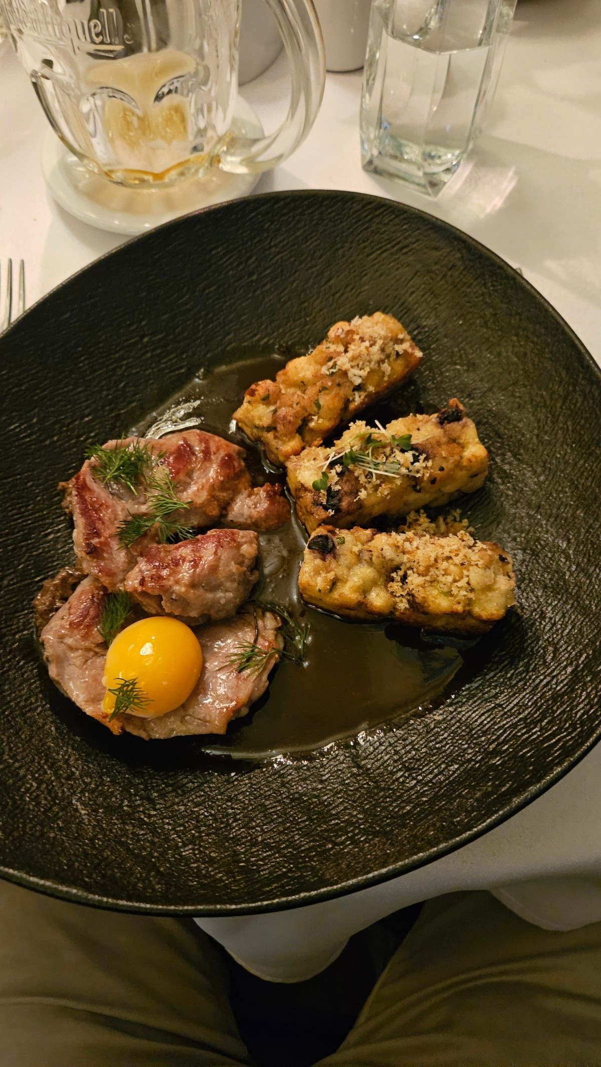 Detailní snímek luxusně vyhlížejícího jídla podávaného v restauraci na tmavém talíři v rámci vyšší gastronomie.