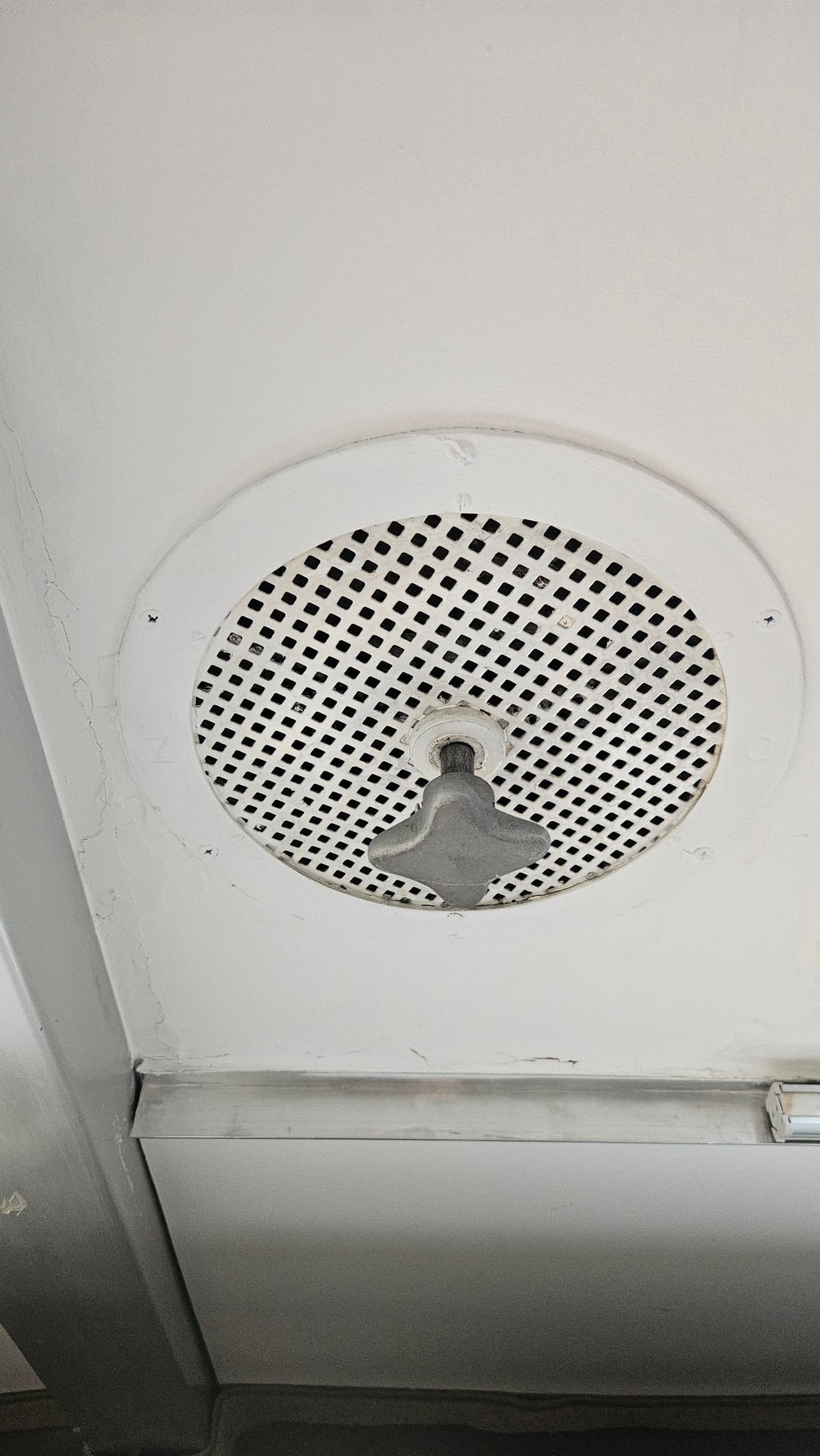 Kruhový ventilační průduch na zdi pokoje, který je pozůstatkem tehdejšího systému centrální ventilace.