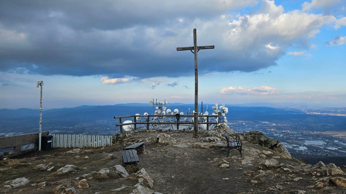 Široký panoramatický výhled do krajiny z vrcholu hory, kde sluneční paprsky dramaticky prosvítají skrz mraky.