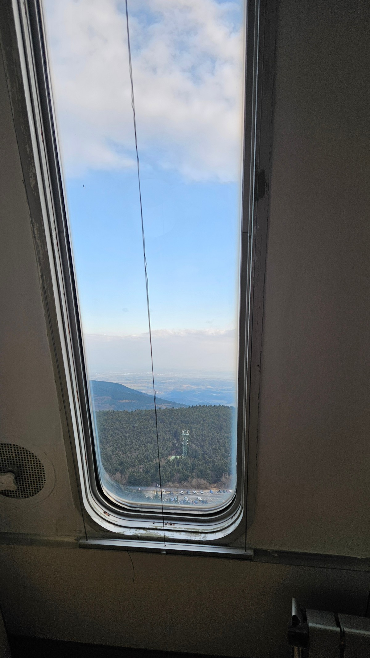 Úzké zkosené okno v hotelovém pokoji poskytující částečný výhled na strmý sklon pláště vysílače a oblohu.