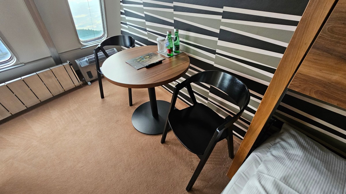 Skosená okna v ubytovacím pokoji s krásným výhledem, stůl a židle umístěné u okna v původním retro stylu.
