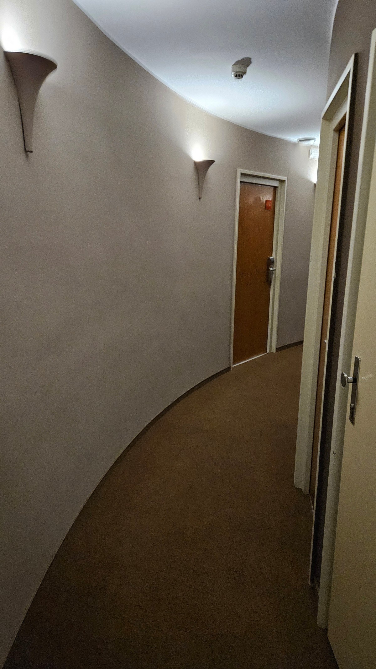 Úzká spojovací chodba se zúženým prostorem vedoucí k pokojům uvnitř ubytovací sekce.