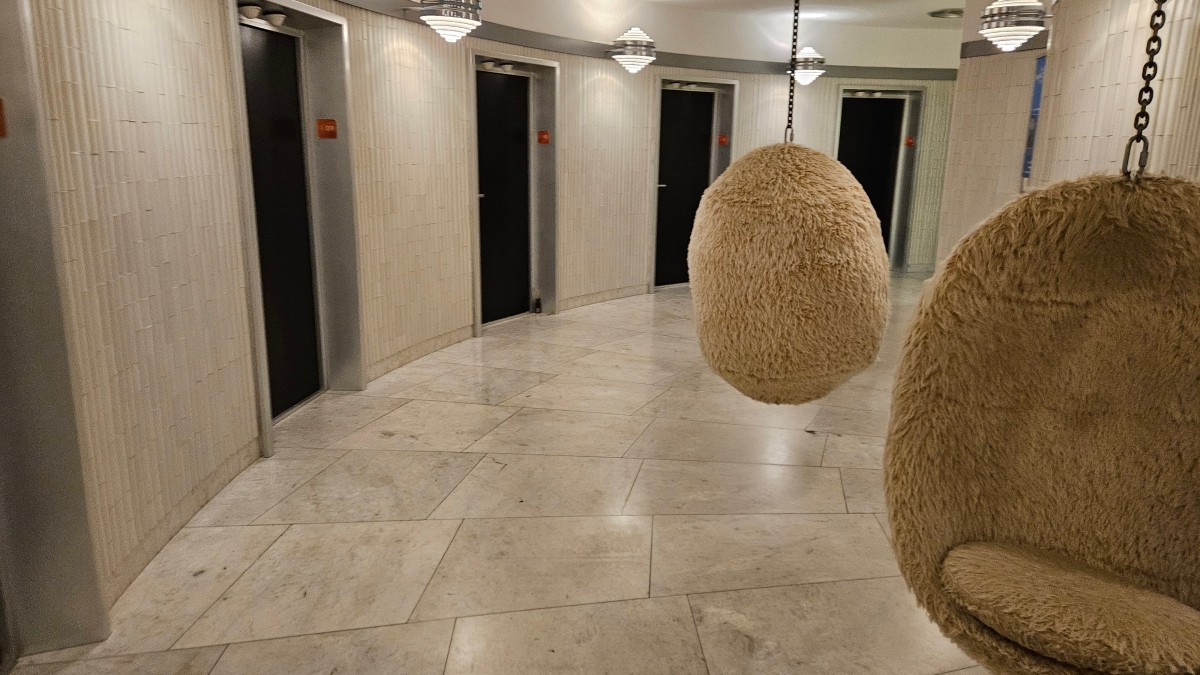 Záběr na ikonická designová křesla zavěšená ze stropu ve společných prostorech hotelu na Ještědu