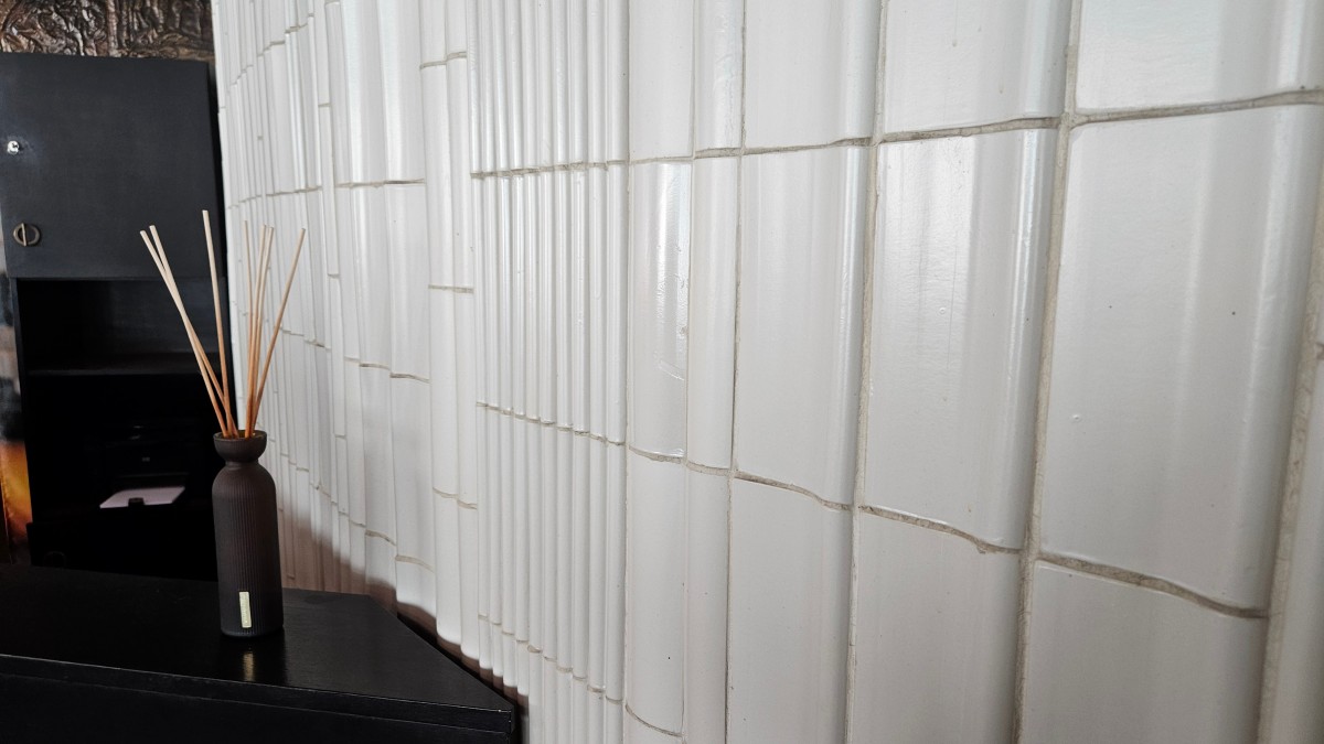 Pohled do chodby s keramickým obkladem na stěnách, v pozadí se rýsuje tmavší zákoutí a přechod do další části.