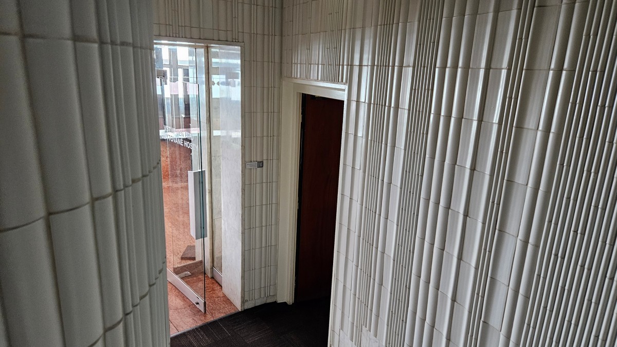 Průhled hotelovou chodbou s keramickými obklady směřující k oknu, kterým dovnitř dopadá přirozené světlo.