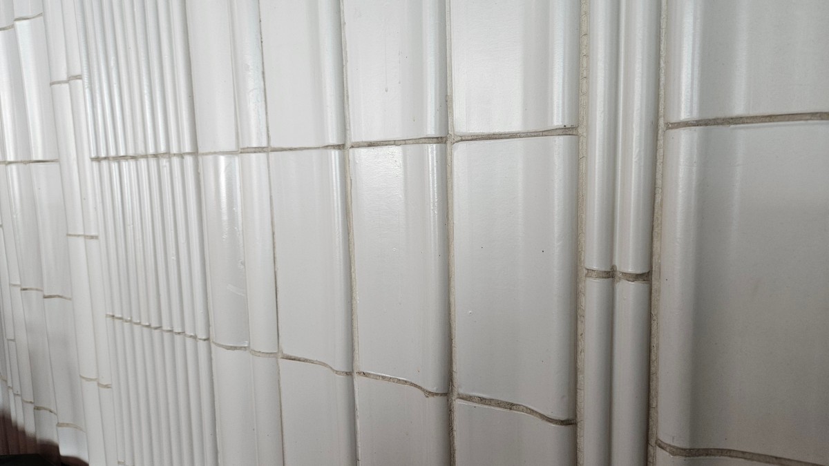 Širší záběr na stěnu vnitřní chodby, která je plně obložena charakteristickými šedivými keramickými dlaždicemi._opraveno