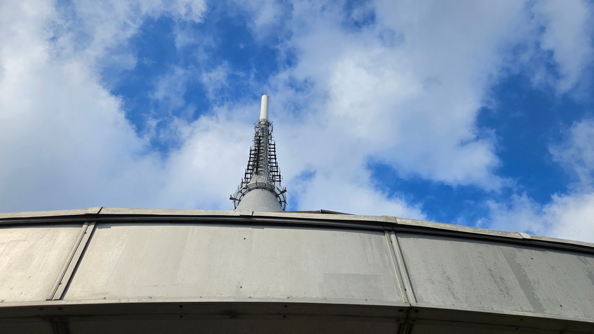 Spodní prstenec budovy vysílače s informačními nápisy, foceno přímo z venkovního prostranství.