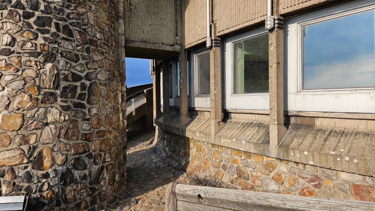 Záběr na venkovní betonový ochoz a část obvodové architektury budovy