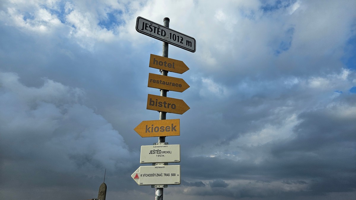 Turistický rozcestník umístěný na vrcholu Ještědu s temnými mračny v pozadí.