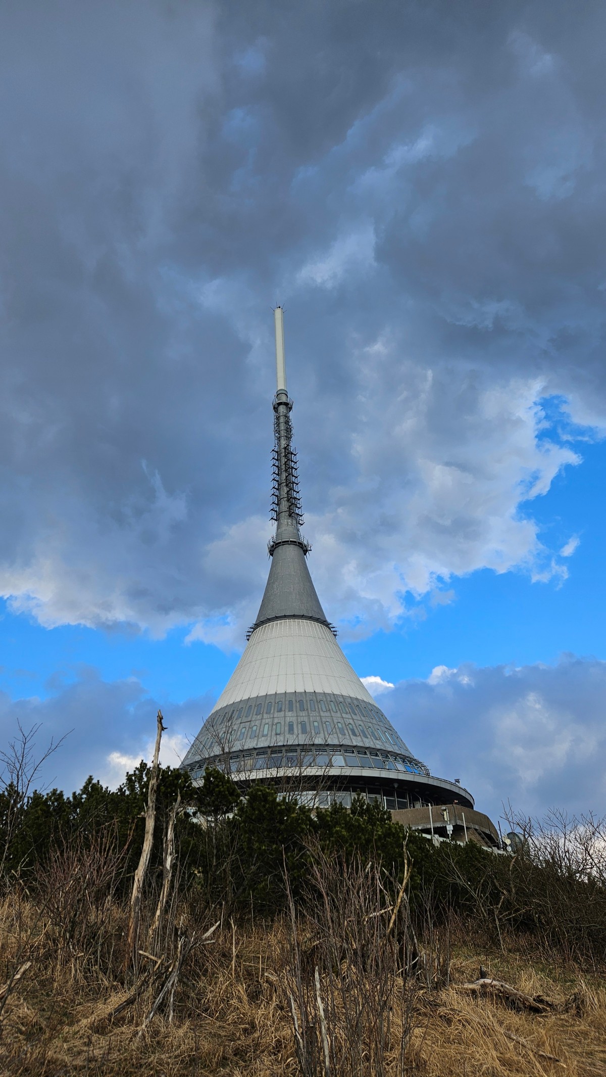 Ikonický televizní vysílač Ještěd zachycený zespodu, tyčící se majestátně proti modré obloze s mraky.