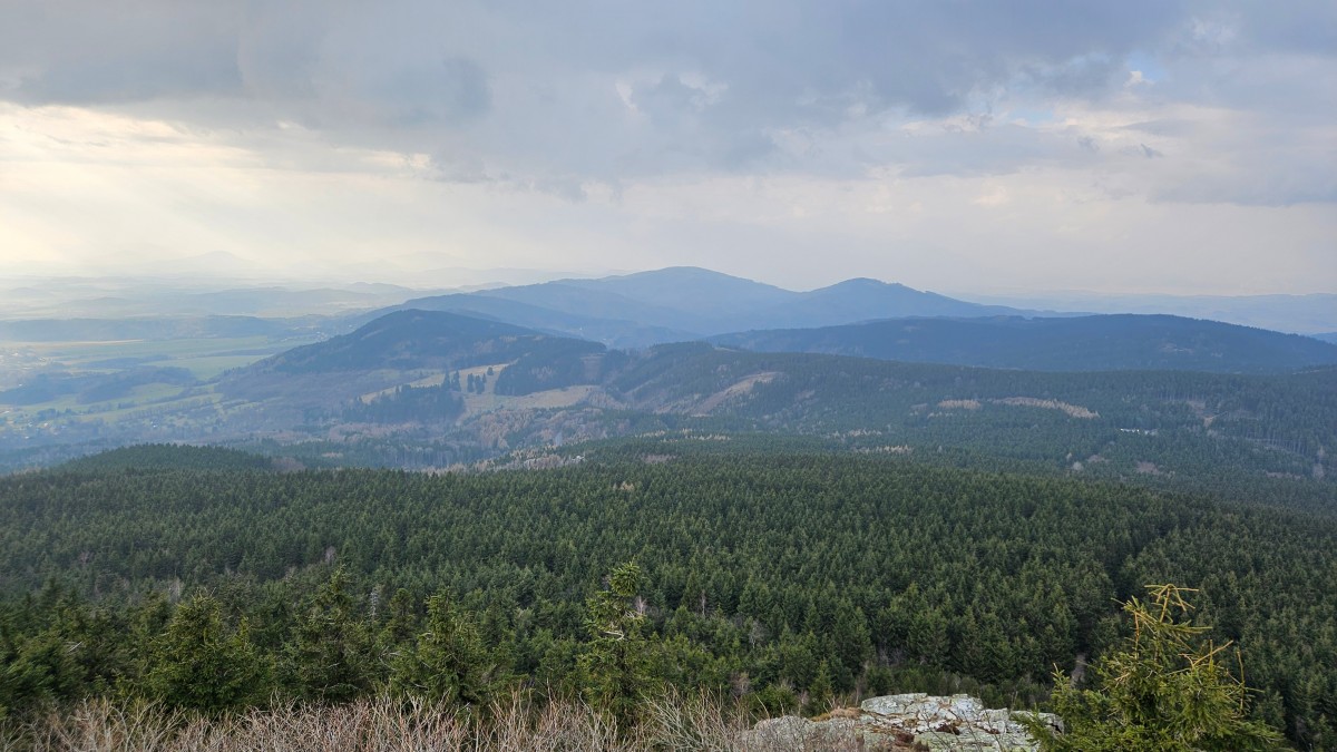 Nádherný široký výhled do okolní zalesněné krajiny a údolí z venkovní vyhlídky na vrcholu hory.