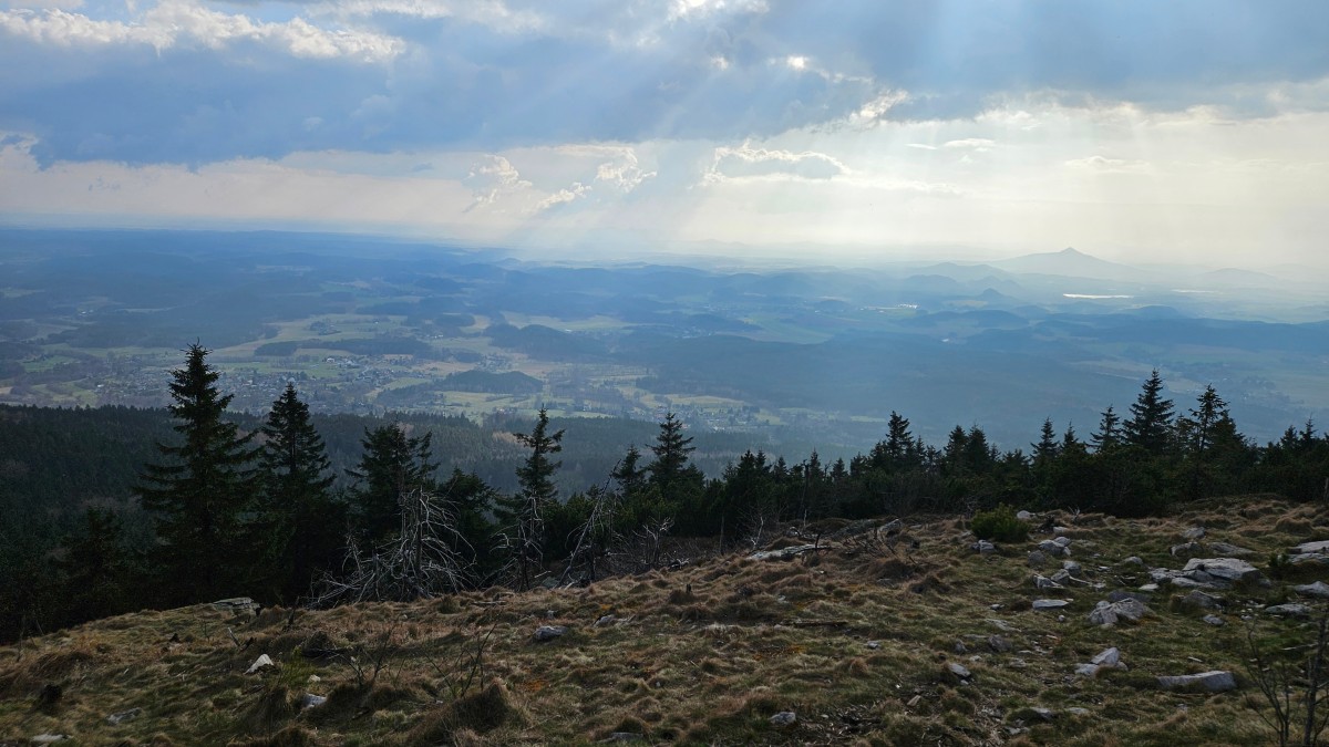 Panoramatický pohled na zvlněnou horskou krajinu a lesy, obloha s dramatickými temnými mraky v pozadí.