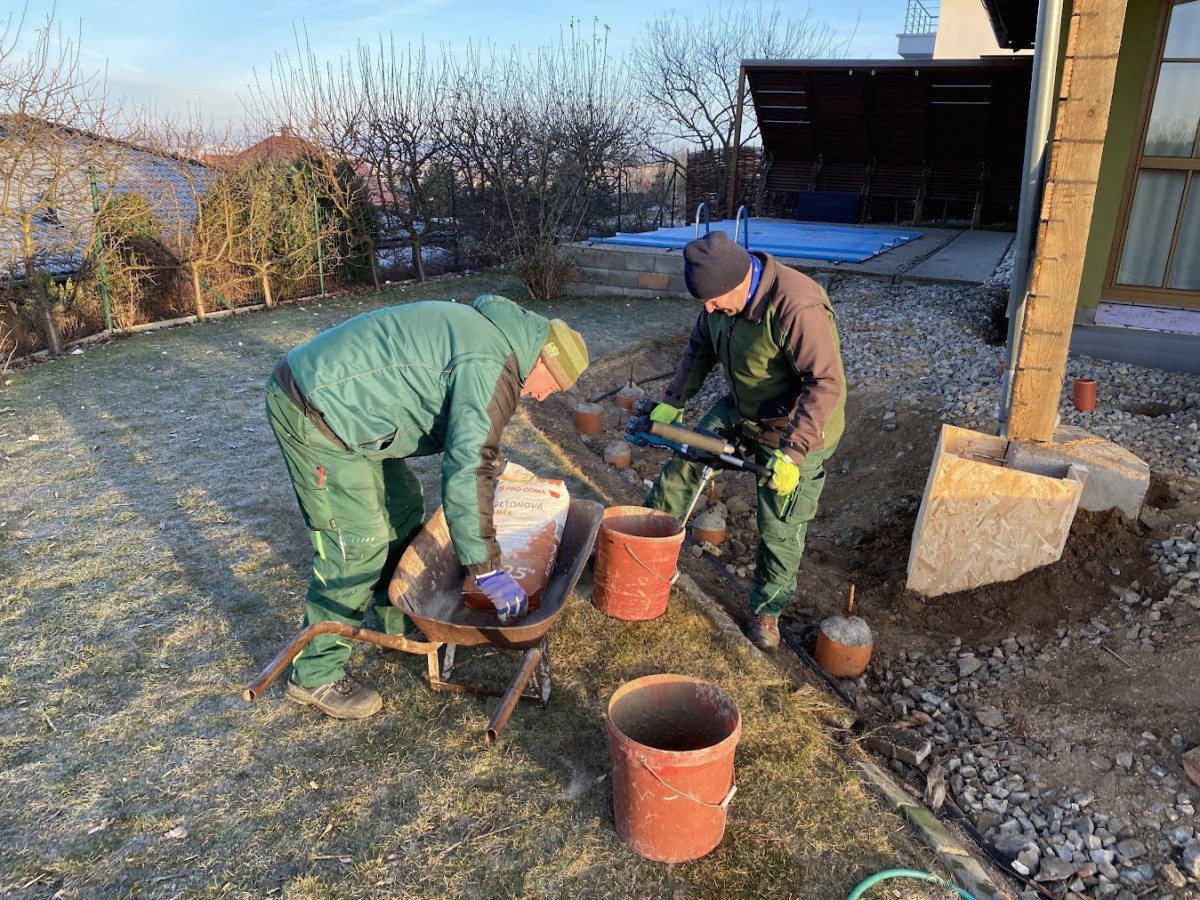 Dva řemeslníci připravují beton. V pozadí je vidět betonová patka a sloup terasy
